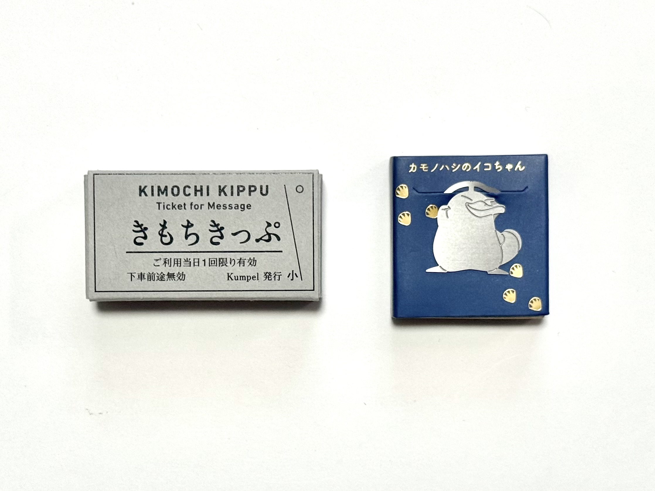 切符の形をしたメッセージカード「きもちきっぷ」と、カモノハシのイコちゃん「エッチングクリップス」です♪