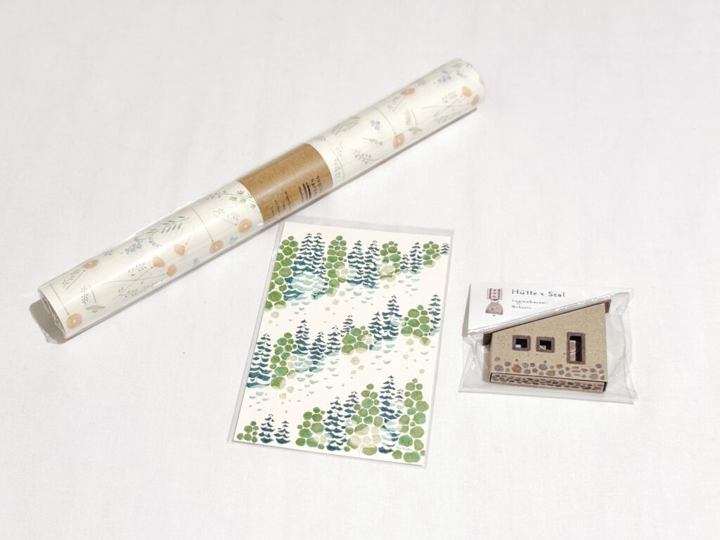 左からラッピングペーパー、ポストカード、フレークシールです。
