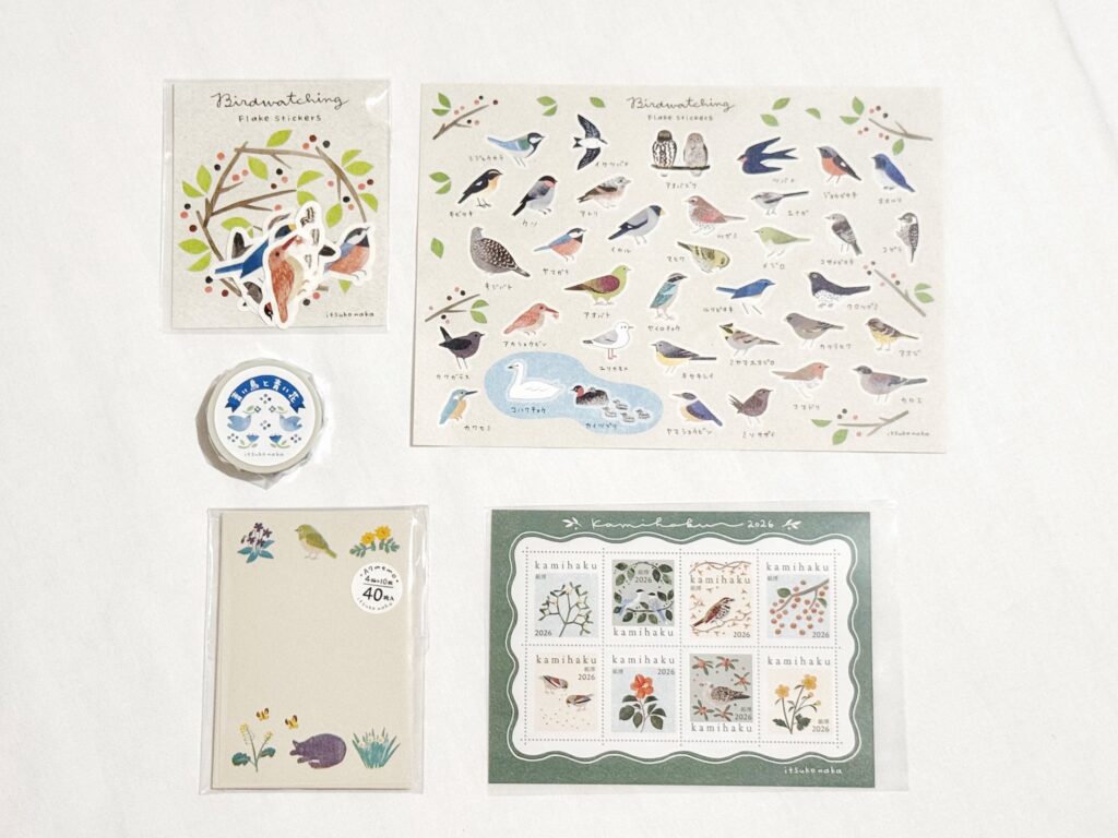 ほかには、青い鳥と青い花のマスキングテープ、春夏秋冬の植物と動物が描かれたメモセット、紙博限定の切手風シールを購入しました!