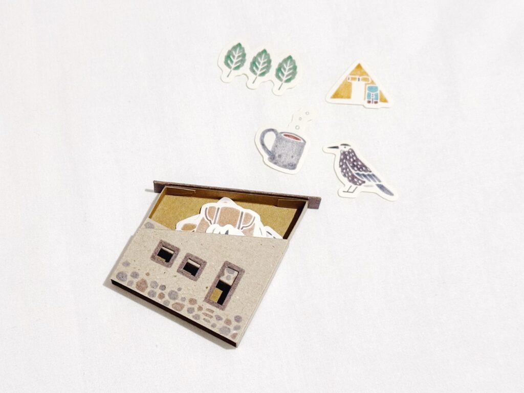 フレークシールは、屋根の部分をスライドさせるとシールを取り出せるようになっていて、遊び心がある感じです。