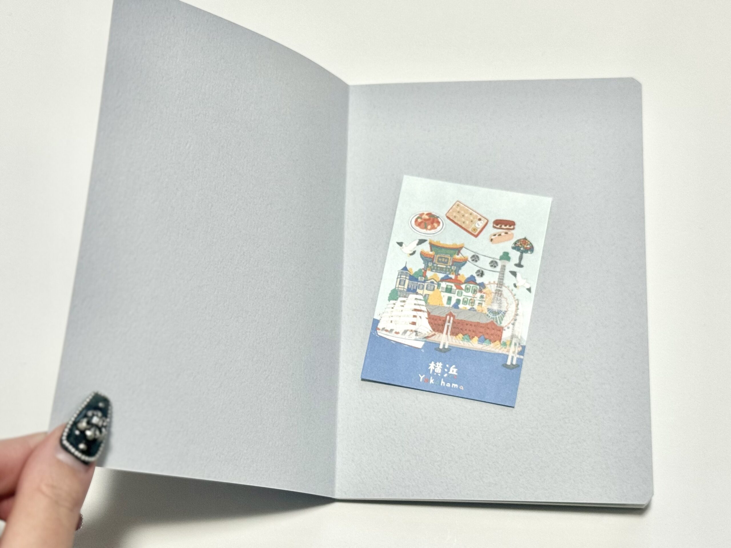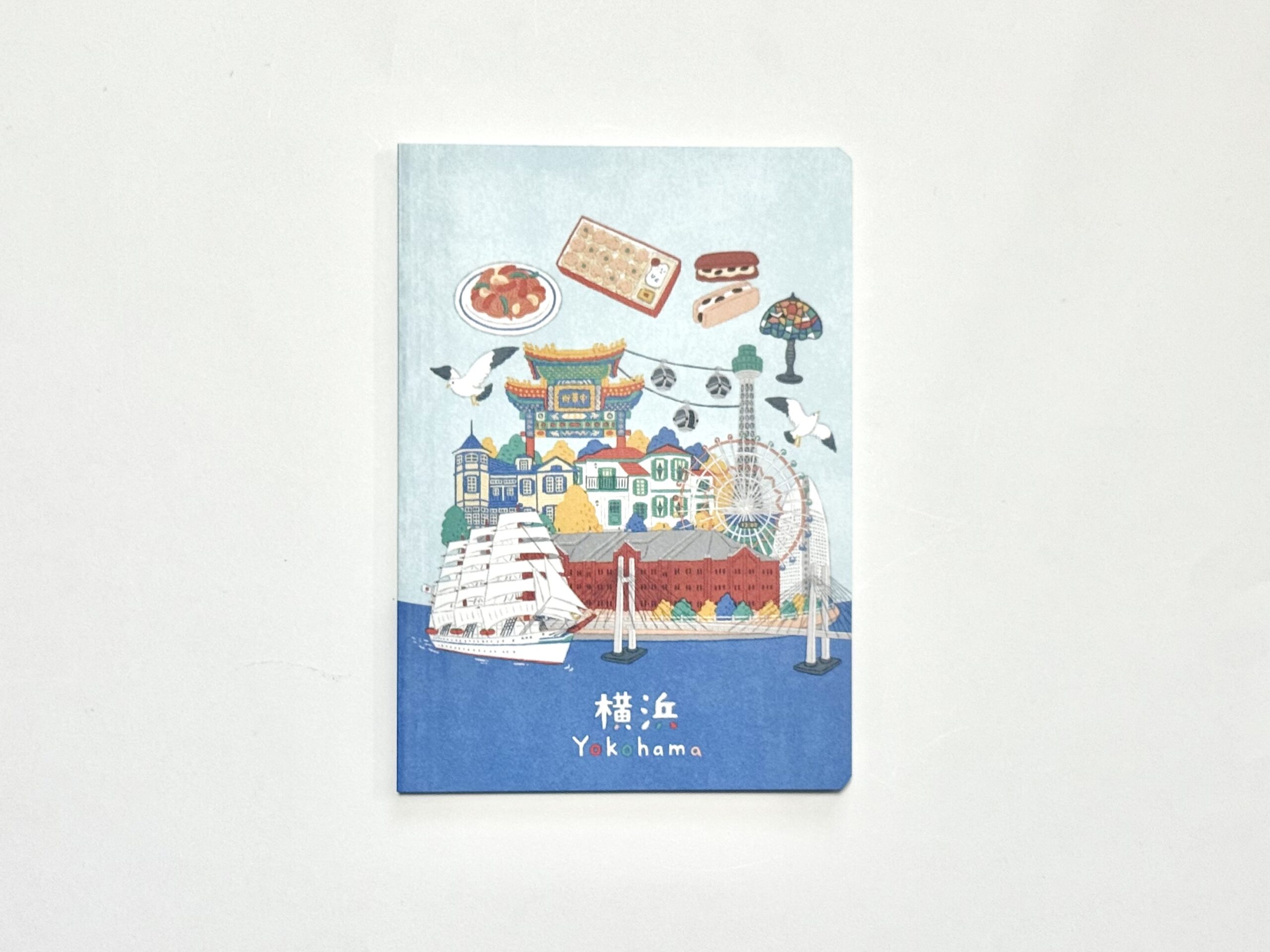 横浜の海を思わせる青色がベースで、中華街や赤レンガ倉庫らしい赤色がアクセントになった素敵なイラストですね。レジに並んでいる間、ずーっと眺めていました。